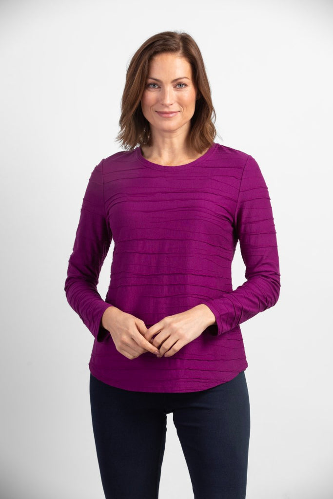 The Steady Stream Tee is as stylish as it is comfortable. You'll adore the sophisticated texture of this relaxed fit top. It has a lightly shaped silhouette with a touch of spandex for the ultimate flattering fit. The becoming rounded hemline looks fantastic worn untucked with leggings or pair with trousers for professional polish.